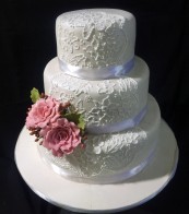 Rich Plum Cake tiers covered with marzipan and fondant, decorated with a brush embroidery icing and sugarpaste wildroses. Standard weight - 10 kgs Available in customized flavours and sizes.